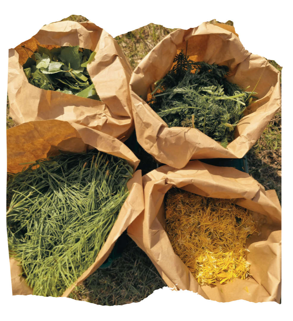Nokkosesta teemme peston ja yrttikylvyn. Maitohorsmasta Ivan Chain (opit fermentoimaan) ja kukkaöljyn. Katajasta suitsuke ja katajamarjauutteen. Koivusta vastan ja lehtiteen. Kanervasta iltakylvyn ja tinktuuran. Siankärsämöstä haavasprayn ja salvan.